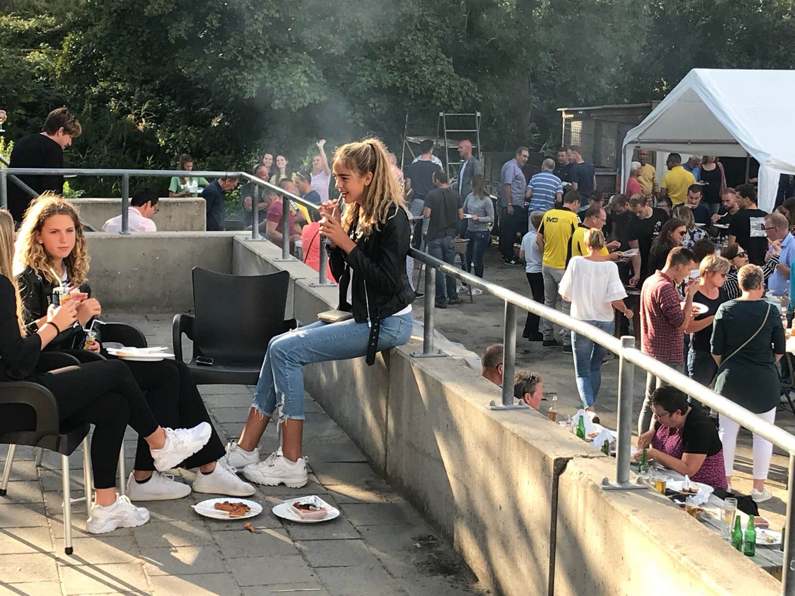 De opgestelde barbecues met de eetlustigen daar omheen opgesteld, en de rookpluimen die op verschillende plaatsen opstegen, hadden van een afstandje iets weg van een offerfeest. In zekere zin geldt dat zeker voor de eiwitten die op de BBQ werden dichtgeschroeid en in een gezellige sfeer het strottenhoofd passeerden. De organisatie steeg boven zichzelf uit door de timing van het vuurwerk dat in de vorm van bliksem en donder vanuit het westen richting het sportveld opschoof. En de organisatie deed het toch al zo voortreffelijk! Naarstig werden de spullen in veiligheid gebracht en daarop had de regen juist gewacht. Een pittig exemplaar dreef de feestgangers het clubhuis in en ook dat was volgens planning. De luchtvochtigheid deed de aanwezigen transpireren en degenen die dat teveel werd, vluchten naar buiten.
