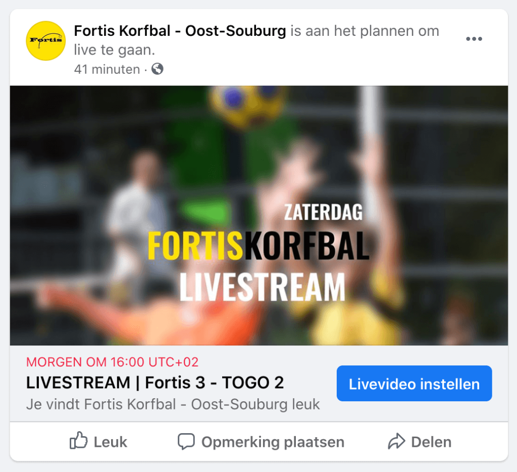 De proef van vorige week, waarbij twee thuiswedstrijden bij Fortis Korfbal live via Facebook zijn gestreamd, is goed ontvangen bij de kijkers én de vereniging. In overleg met het bestuur heeft het Marketing Communicatie Team (MCT) dan ook besloten hiermee door te gaan.