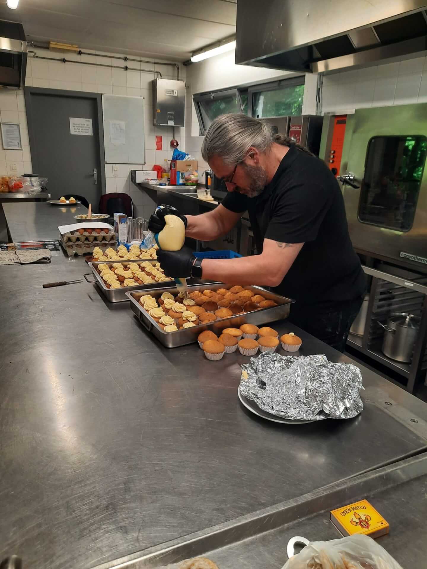 Na flink wat gespeur en nog wat vrije tijd, werd het weer tijd voor de lunch. Onze vaste keukencrew had nog last van hun pannenkoeken-bak-armen van vorig jaar, dus daarom werd er dit jaar uitgepakt met een heerlijk versgebakken cupcake, met topping, natuurlijk in het Fortisgeel! Mmmm, heerlijk was hij.